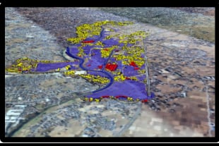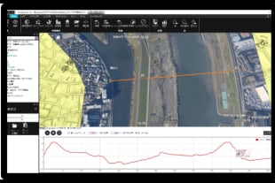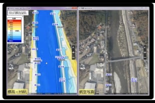 航空写真や衛星画像などのカラー画像と、3次元データを統合しているため、高さごとの色分け表示が可能です。データと視覚によって、河床・堤防高の健全性を確認することができます。