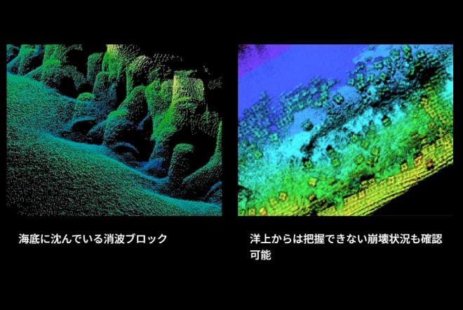 船舶からナローマルチビームソナーをえい航し、地底の地形を取得。湖や海洋などの水底計測に有効です。グリーンレーザーで取得できない、水深の深い箇所でも計測が可能です。