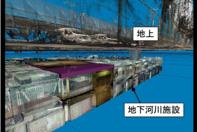 道路の地下に設置されている河川施設の実際の現場において、安全性の向上を目指し、センサーや各種ICT機器を用いた新たな点検手法の検討を行った事例です。3次元空間上に情報を統合することで、これまでにはできなかったさまざまなことが可能になりました。