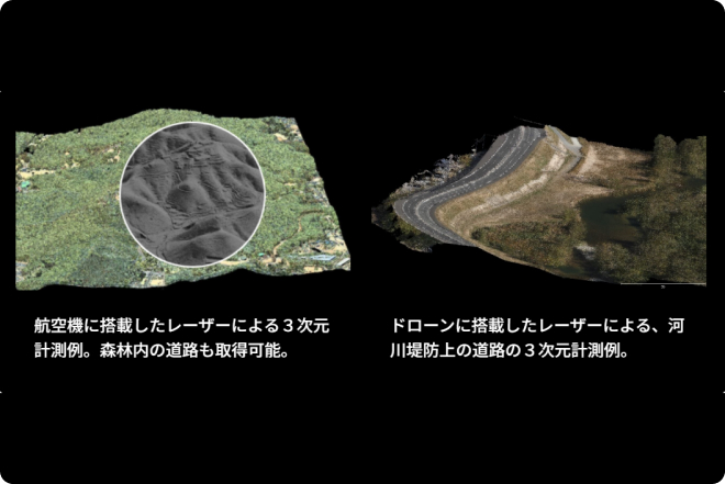 航空機やドローンに搭載したレーザー計測システムから、地表にむけてレーザーを照射することで、3次元座標を取得します。長距離の道路の計測や、植生下の地形の計測、工事進捗状況の計測に有効です。これらの手法を地域や地形、成果用途に応じて使い分けています。